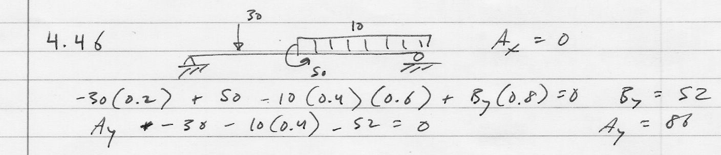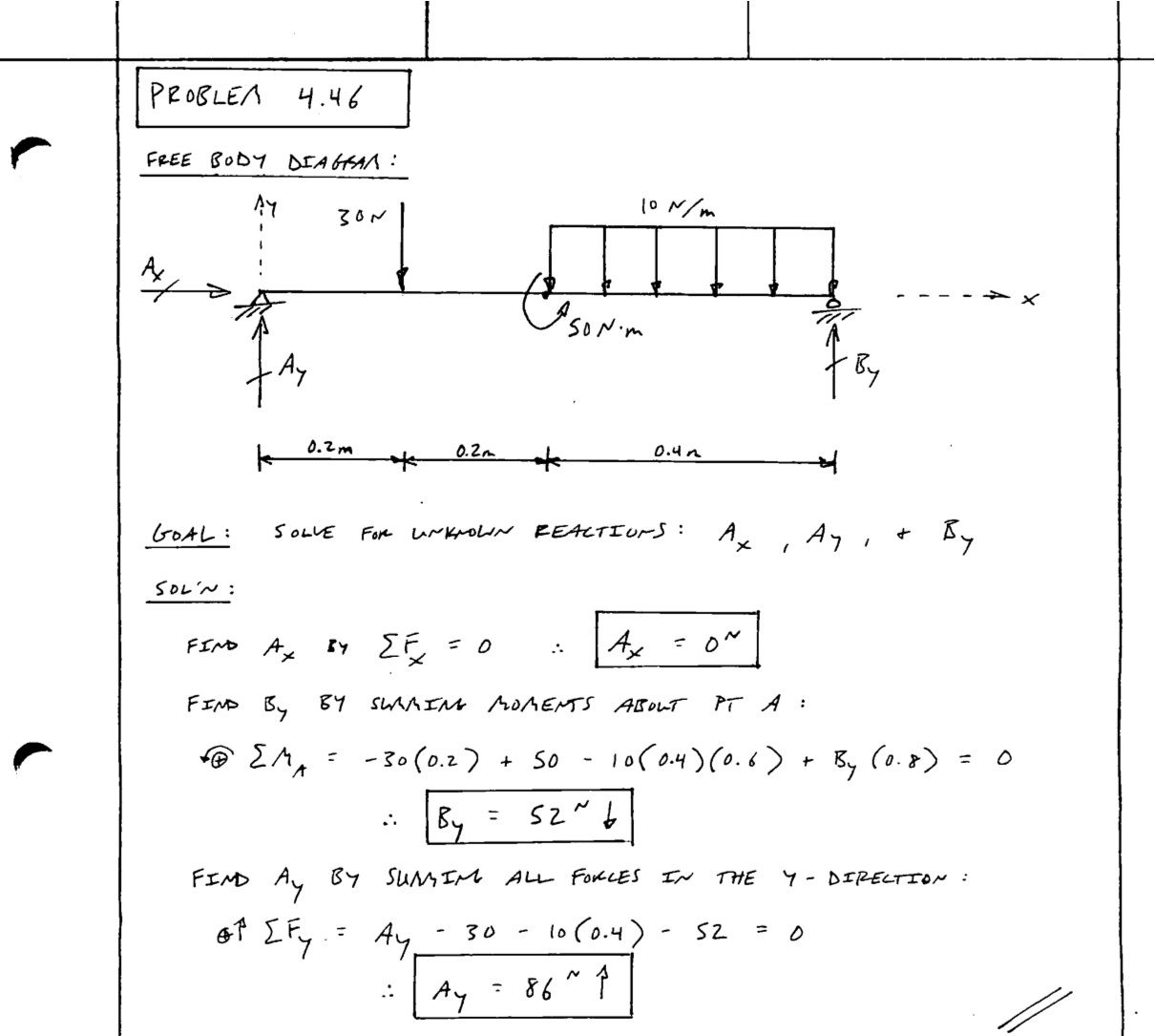 This solution is written on ruled notebook paper, the figure is sloppy (no dimensions, no units, no coordinate system), the results are unlabeled, and the solution isn’t at all annotated. This is poor technical communication in comparison to the following which excels at each of these points.