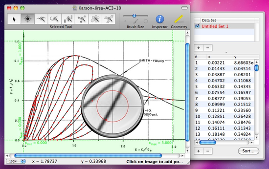 To digitize a graph with ClickGraph, you simply copy a screenshot of your graph to the clipboard and paste into the main window. It asks you to input the four coordinates bounding the plot area, and then you trace the curves. There is an auto-detection feature which I didn’t have great success with. Here’s a rough pass on a graph I’m using in my research.